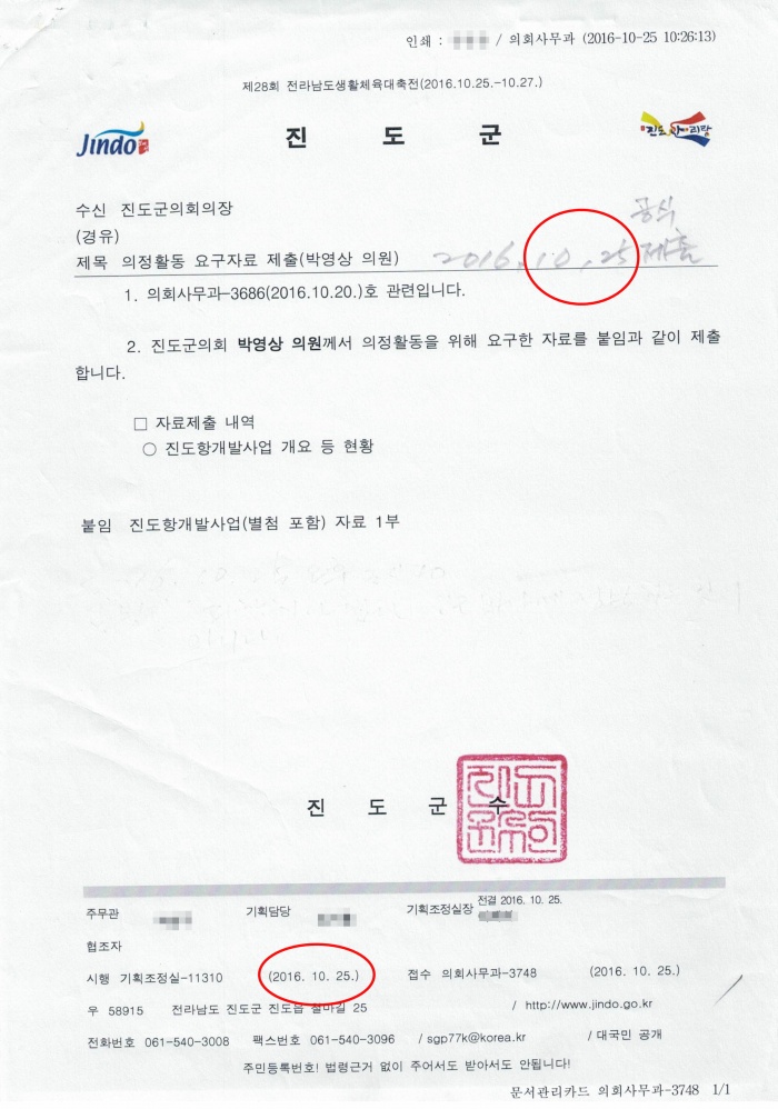 공교롭게도 이 요구자료에 대한 답변 자료는 진도군이 석탄재 바지선에 대해 최초 회항지시한 25일 박영상 의원에게 전달되었다. 그런데 자료에 첨부된 내용 가운데서 ‘5-②운반비 분담 비율의 법적근거’와 ‘7.폐기물처리업체와 하동발전소의 운송계약서,공동수급표준협정서(분담이행방식)’ 등이 누락되어 있었다.