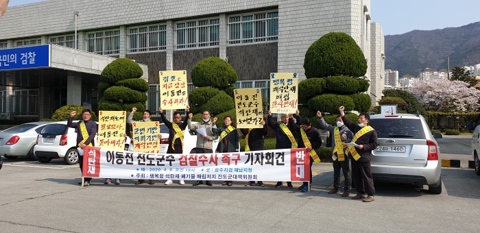 대책위는 이날 10시, 광주지방검찰청 해남지청 앞에서 기자회견을 갖고 "2016년부터 현재까지 팽목항 폐기물 반입에 대한 숱한 의혹을 제기하면서도 진도군과 이동진 군수가 스스로 석탄재 폐기물업체와 유착 의혹을 떨치고 진도토사로 이 사업을 조속히 마무리해 줄 것을 요청했다"면서 "그러나 최근 이동진 군수는 공무원 조직을 동원해 코로나19 비상방역 정부지침을 위반하면서까지 진도군청, 각 읍·면사무소에서 군민들을 상대로 관제 데모를 여는 등 상식적으로 이해할 수 없는 독선 행정을 하고 있다"고 비판했다.