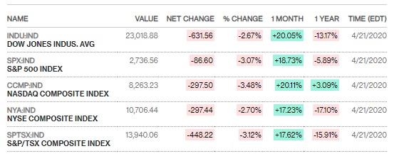 유가 폭락세는 뉴욕 증시에 또다시 하방 압력을 가했다. 이날 뉴욕증시의 다우존스30산업평균 지수는 631.56p(2.67%) 하락한 2만3018.88에 거래를 마쳤다. 스탠더드앤드푸어스(S&P)500 지수는 86.6p(3.07%) 내린 2736.56에, 기술주 중심의 나스닥 지수는 297.5p(3.48%) 떨어진 8263.23에 각각 마감했다.