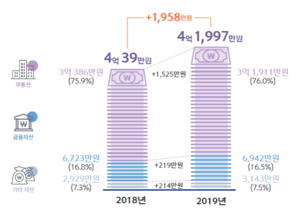 지난해 평균 가구당 총자산은 4억1197만 원으로, 2018년보다 1958만 원 증가했다. 이번 보고서는 지난해 9~10월 전국 만 20~64세 경제활동을 한 1만 명을 이메일로 조사한 결과다. 표본오차는 95% 신뢰수준에서 최대 허용 오차는 ±0.98%p다.