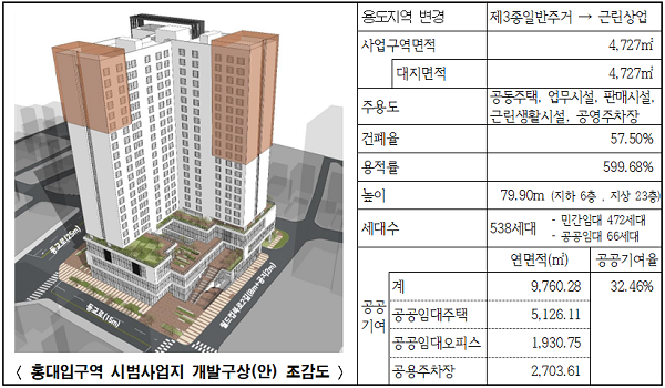 이를 위해 시는 용도지역 상향(일반주거→상업지역 등)을 통해 용적률을 높이고, 증가한 용적률의 50%를 공공임대시설, 공용주차장 등 지역에 필요한 시설로 공공기여를 받는 방식으로 사업을 추진할 계획이다.