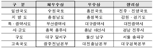 특히 그간에는 고속ㆍ일반국도 및 지방도까지만 대상으로 했으나 지난해부터는 전국의 모든 도로의 관리를 강화하기 위한 목적으로 시ㆍ군ㆍ구에 대해서도 도지사와 시장이 1차 자체 평가를 한 결과를 바탕으로 중앙 합동평가에 포함ㆍ실시해 우수 기관을 선정했다.