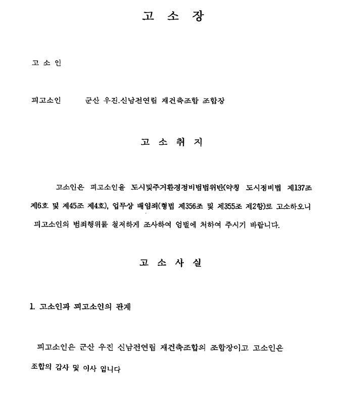 그런데 도시정비업계 소식통 등에 따르면 우진신남전 재건축 조합 관계자 등은 최근 조합장에 대한 고소장을 군산경찰서에 접수했다. 해당 조합장은 「도시 및 주거환경정비법(이하 도시정비법)」 제137조제6호 및 제45조제4호, 「형법」 제356조 및 제355조제2항 등의 업무상 배임죄가 있다는 게 고소인들의 주장이다.