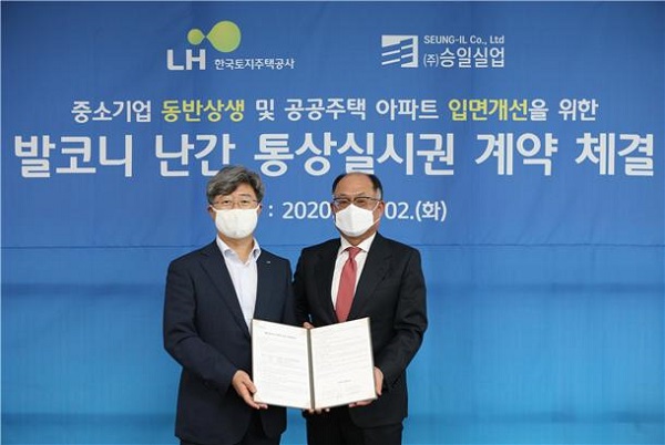지난 2일 LH는 중소기업과의 동반성장 및 공공주택 외부 디자인 개선을 위해 승일실업과 아파트 발코니 난간 특허권 및 디자인권에 대한 통상실시권 설정 계약을 체결했다고 밝혔다.
