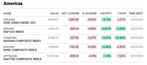지난 11일(현지시간) 뉴욕증권거래소(NYSE)에 따르면 다우존스 30 산업평균지수는 전장보다 1861.82p(6.9%) 폭락한 2만5128.17에, 스탠더드앤드푸어스(S&P)500 지수는 전장보다 188.04p(5.89%) 급락한 3002.1에, 사상 최초 1만 고지를 넘어섰던 기술주 중심의 나스닥도 527.62p(5.27%) 추락한 9492.73에 장을 마감했다.
