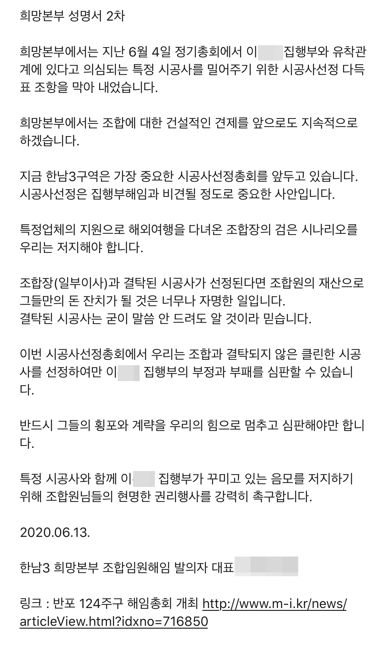 조합 임원 해임발의를 한 희망본부 측에서는 "조합 홍보지침을 여러 차례 위반한 사례가 있음에도 불구하고 특정 시공자를 밀어주기 위해 고의로 경고 공문을 늦게 발송한 것으로 보이는 정황이 포착됐다"며 "또 특정 업체의 지원으로 해외 박람회 시찰 등을 다녀왔다는 조합장에 대한 의문과 한남3구역 조합과 특정 건설사 결탁이 합리적으로 의심된다며 이에 대한 성명서를 조합원들에게 발송했다"고 밝혔다.