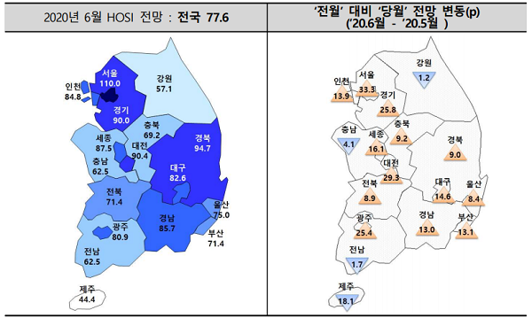 지역별로 서울(110)이 유일하게 110선을 기록했다. 서울이 100선을 넘어선 것은 지난해 12월 이후 6개월 만이다. 이어 경북(94.7)과 대전(90.4), 경기(90)는 90선을 기록했고, 세종(87.5), 경남(85.7), 인천(84.8), 대구(82.6), 광주(80.9)가 80선으로 나타났다. 반면 강원(57.1)과 제주(44.4)는 40~50선을 기록했다.