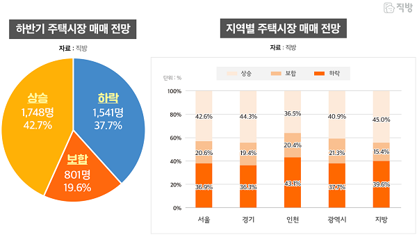 지난 1일 부동산 정보업체 직방은 이용자들을 대상으로 하반기 집값 전망을 예상하는 설문조사를 실시한 결과, 전체 응답자 4090명 중 42.7%인 1748명이 하반기 주택 매매시장이 상승할 것이라고 응답했다고 밝혔다.