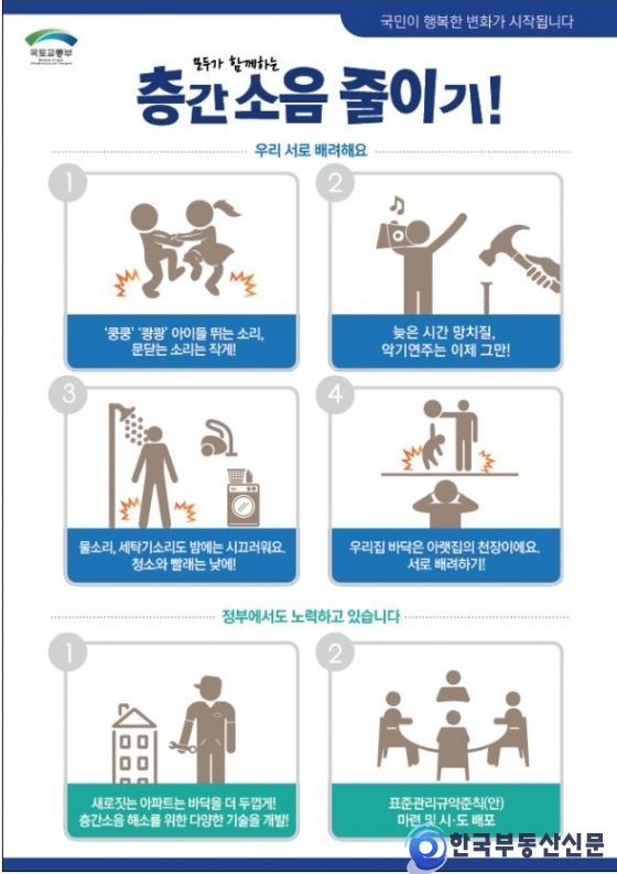 국토교통부(장관 서승환)는 층간소음 방지를 통한 이웃간 분쟁을 줄이고, 쾌적한 주거환경을 조성하기 위해 소규모 주택의「층간소음 방지 가이드라인」을 마련하여 8월 13일 시달하였다고 밝혔다.
