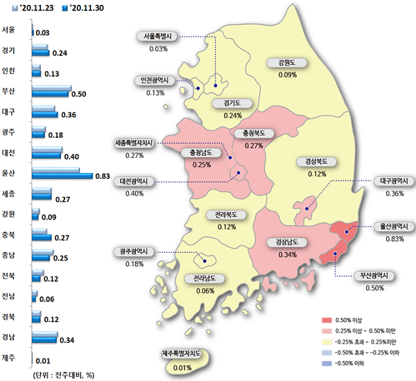지방(0.31%)은 전주 상승폭을 유지했다. 시ㆍ도별로 울산(0.83%), 부산(0.5%), 대전(0.4%), 대구(0.36%), 경남(0.34%), 세종(0.27%), 충북(0.27%), 충남(0.25%), 광주(0.18%), 전북(0.12%) 등이 상승했다.