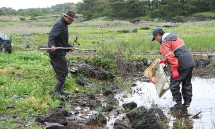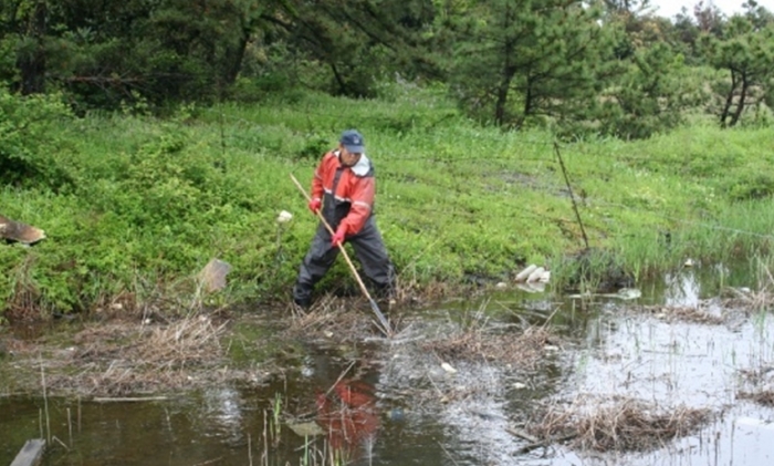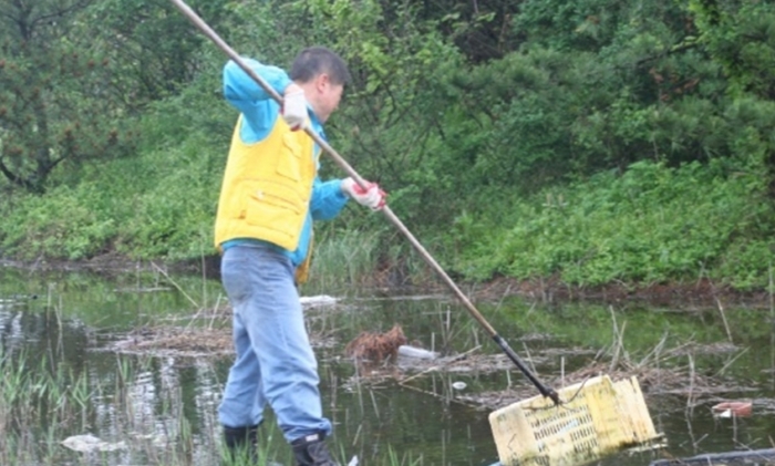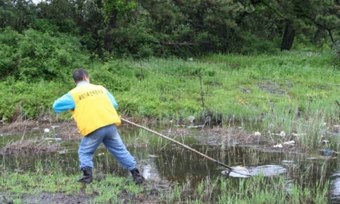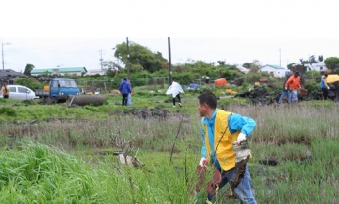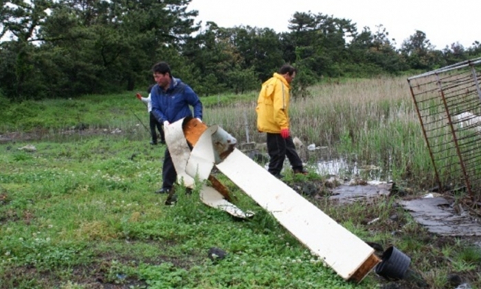 아침부터 비가 내리기 시작하여 서로의 눈치만 보면서 누가 먼저 선뜻 악취가 진동하는 습지에 발을 들여 놓을 수 없었다. 오원종(국제가족동제주회 회장)씨가 습지 가운데로는 들어가지 못하고 가장자리에서 긴 장대에 갈쿠리를 메달아 비닐과 쓰레기를 건져내기 시작하면서 참여자들은 각자 주변의 오물을 치우기 시작하였다.