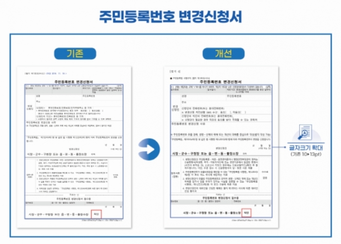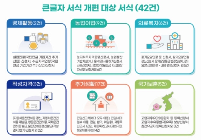 이번 시행규칙 개정으로, 노년층 등 디지털 약자의 이용 빈도가 높은 서식과 오프라인 방문 이용건수가 많은 서식 등 민원서식 42종이 큰 글자 서식을 적용할 수 있게 됐다.