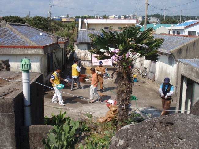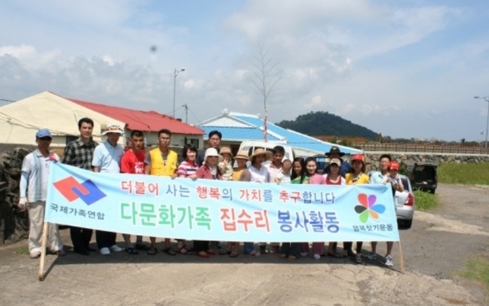 2011. 7. 17 서귀포시 성산읍 관내 다문화가족(국제결혼가족) 모임인 국제가족동제주회(회장, 이형삼) 회원 30여명은 섭씨 30도를 오르내리는 무더위 속에서 관내 성산읍 성산리 강 모 할머니(83세, 독거노인)의 집을 방문하여 집수리 봉사활동을 전개했다.