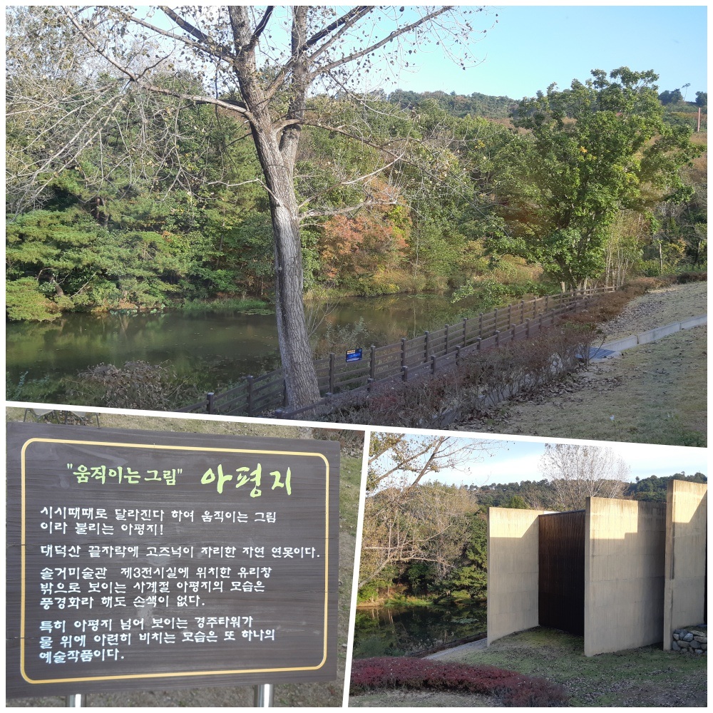 솔거미술관(경상북도와 경주시가 지원한 최초의 공립미술관, 2008년 한국화의 거장 소산 박대성 화백이 작품 기증 의사를 밝히면서 건립이 추진돼 2015년 완공됨) 제3전시실에서 창문을 통해 아평지를 볼 수 있다.