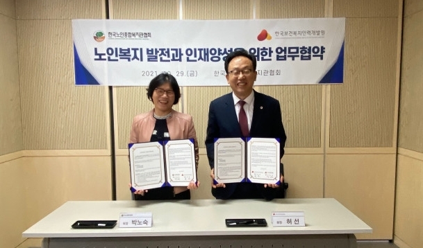 한국보건복지인력개발원(원장 허선, 이하 인력개발원)이 10월 29일(금) 한국노인종합복지관협회(회장 박노숙, 이하 협회)와 노인복지 실천 현장의 전문 인재 양성과 협력 성장 기반 도모를 위한 업무 협약을 맺어 양 기관이 힘을 모으기로 했다.