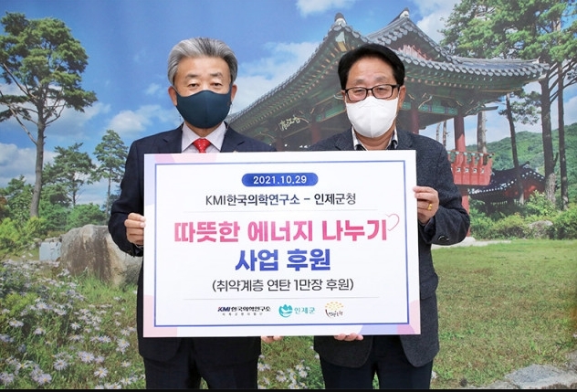 KMI한국의학연구소 사회공헌사업단(단장 한만진)은 10월 29일 강원도 인제군청(군수 최상기)을 방문해 관내 에너지 취약계층을 위한 사랑의 연탄 1만장을 기탁했다.