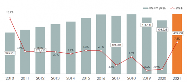한국섬유산업연합회(회장 이상운, 이하 섬산련)는 2021년 국내 패션시장 규모를 전년 대비 7.5% 상승한 43조 3,508억원으로 발표했다.