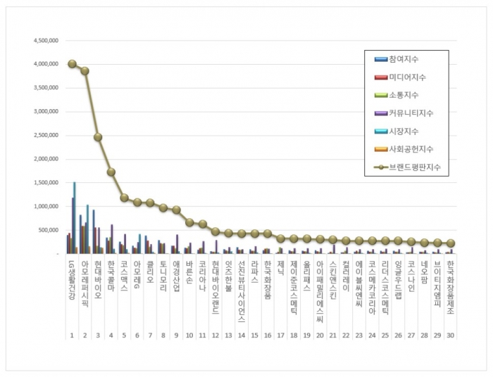 화장품 상장기업 1위를 기록한 LG생활건강 ( 대표 차석용 ) 브랜드는 참여지수 396,305 미디어지수 438,116 소통지수 329,519 커뮤니티지수 1,185,796 시장지수 1,518,264 사회공헌지수 144,028이 되면서 브랜드평판지수 4,012,027로 분석됐다. 지난 2월 브랜드평판지수 4,652,582와 비교하면 13.77% 하락했다.
