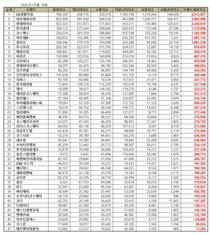화장품 상장기업 브랜드평판 2022년 3월 빅데이터 분석 결과, 1위 LG생활건강 2위 아모레퍼시픽 3위 현대바이오, 4위 한국콜마, 5위 코스맥스 순으로 나타났다.