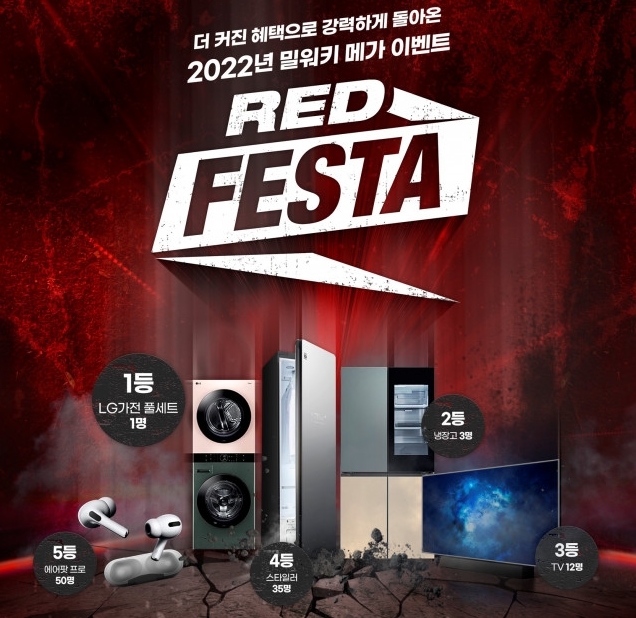 밀워키는 7월 중 경품 추첨을 진행해 △LG 가전 풀세트(1명) △LG 냉장고(3명) △LG TV(12명) △LG 스타일러(35명) △에어팟 프로(50명) 등 총 101명에게 다양한 경품을 제공할 예정이다. 단 1300만원 상당의 1등 경품은 레드쿠폰을 8장 이상 응모한 소비자를 대상으로만 추첨한다. 이벤트와 관련한 자세한 내용은 밀워키 공식 홈페이지 ‘이벤트’ 페이지에서 확인할 수 있다.