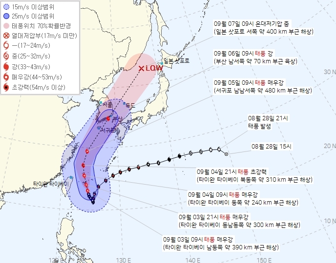 태풍 힌남노는 6일 오전 9시 부산 남서쪽 70㎞ 부근으로 상륙하리라 예상된다. 태풍 위력은 1959년 '사라'나 2003년 '매미'가 상륙했을 때보다 더 클 수 있을 것으로 전망된다.