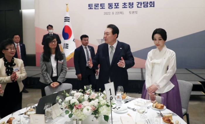 유엔 총회 참석을 마치고 캐나다를 양자 방문 중인 윤석열 대통령 부부는 9.22(목) 저녁 현지 동포 초청 간담회에 참석해 동포사회를 대표하는 분들을 만났다. 이번 행사에는 각계를 대표해 우리 동포 약 200여 명이 참석했다.