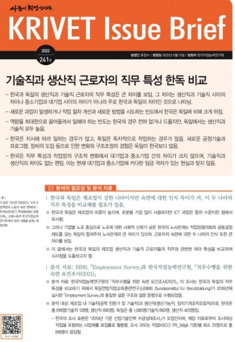 한국직업능력연구원(원장 류장수)은 9월 15일(목) ‘KRIVET Issue Brief’ 제241호 ‘기술직과 생산직 근로자의 직무 특성 한독 비교’를 통해 한국과 독일의 제조업 생산직과 기술직 근로자의 직무 특성을 비교 분석한 결과를 발표한다.