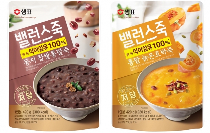우리 맛 연구 중심 샘표가 한 끼에 필요한 식이섬유를 100% 섭취할 수 있는 밸런스죽 신제품 ‘동지 찹쌀통팥죽’과 ‘통팥 늙은호박죽’을 출시했다.