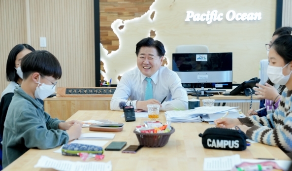 “어린이들이 안전하게 살아갈 수 있는 보행로, 교통안전 시설로 걱정 없이 등․하교할 수 있도록 도우면서, 여러분이 제주에서 공부하고 진학하는 과정에서 부족함이 없도록 하고, 좋은 직장을 갖고 결혼하고 살아갈 수 있는 기반을 만드는 게 목표입니다.” 오영훈 제주특별자치도지사가 26일 오후 집무실에서 인화초등학교 어린이기자단과 만나 인터뷰를 진행하며 이같이 말했다.