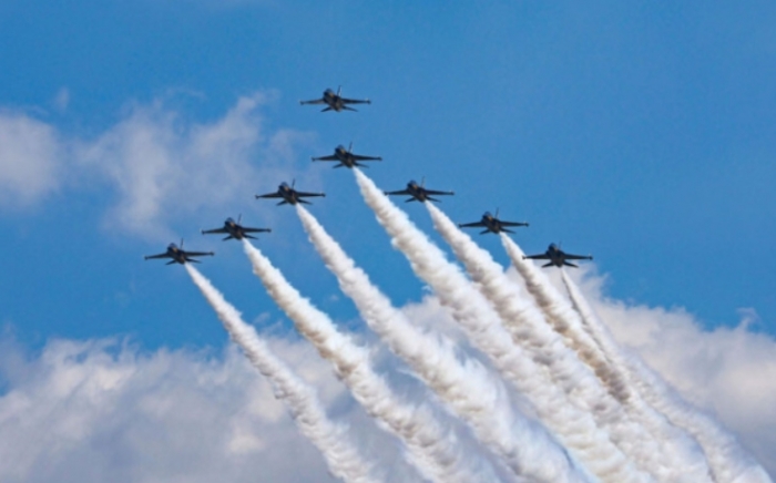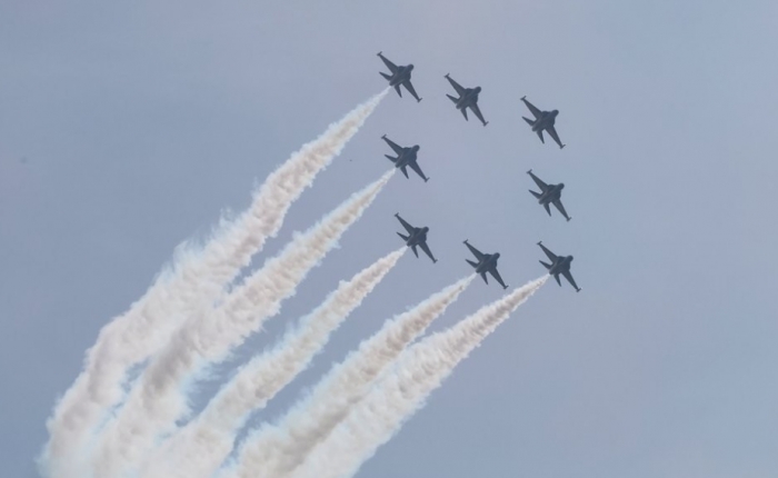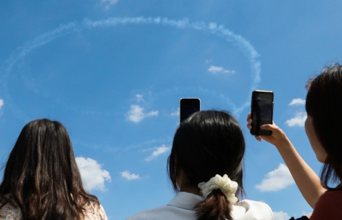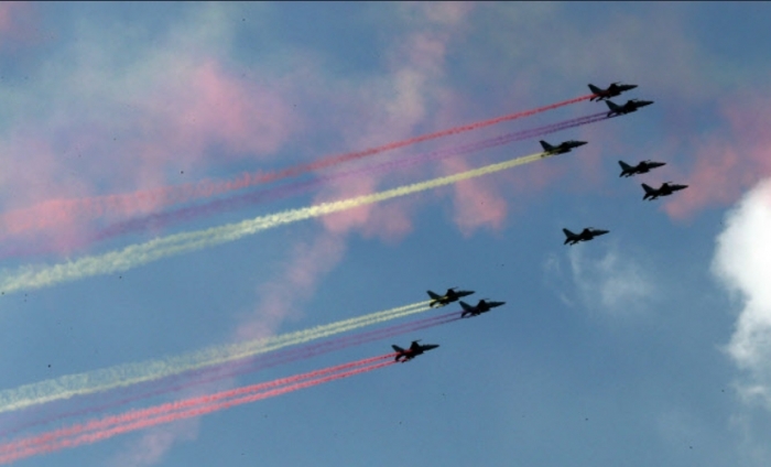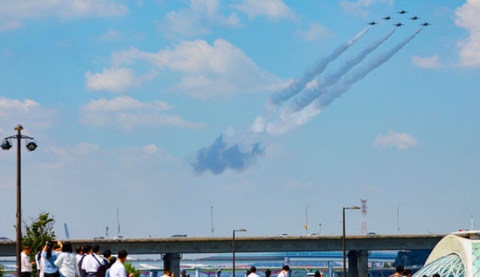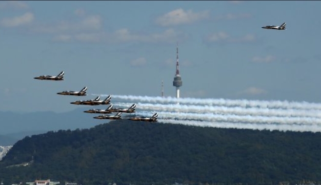 ③ 공중전력 사열 이후에는 블랙이글스가 축하 비행을 선보였습니다. 지난 7월 영국 리아트 에어쇼에서 최우수상과 인기상을 수상한 공군 특수비행팀 블랙이글스는 고도의 팀워크를 바탕으로 태극문양, 알바트로스 대형 등 6개의 고난도 기동을 선보였다.