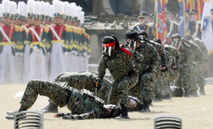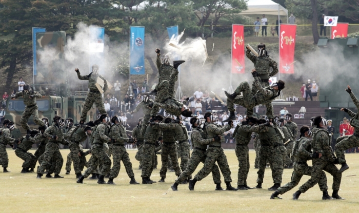 ④ 이어서 육ㆍ해ㆍ공군 및 해병대 특수부대로 이루어진 합동 특공무술팀이 실전적인 전투 모습을 선보였다. 자욱한 연막 속에서 비장한 함성과 함께 등장한 특수부대원들은 제74주년 국군의 날의 의미를 담은 74개의 품새를 비롯해 맨손과 대검을 활용한 상황별 실전 겨루기를 선보였고, 도미노식 격파와 퍼포먼스로 화려함을 더했다.
