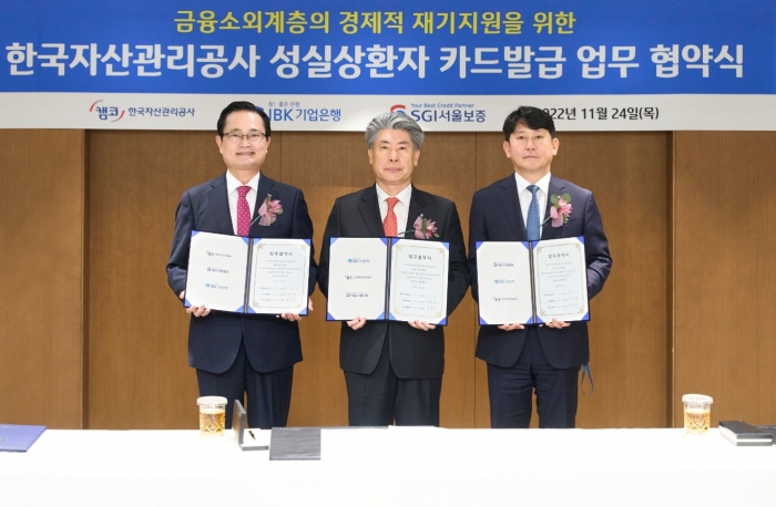 SGI서울보증(대표이사 유광열)은 한국자산관리공사(사장 권남주) 및 IBK기업은행(행장 윤종원)과 24일 서울 중구 IBK기업은행 본점에서 ‘채무조정 성실상환자 카드발급 지원 업무협약’을 체결했다고 밝혔다.