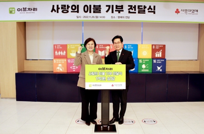 토털 슬립케어 브랜드 이브자리가 11월 28일 서울 사회복지공동모금회에서 ‘2022년 사랑의 이불 전달식’을 진행하고 연말까지 차렵이불 1300채를 기부한다고 밝혔다.