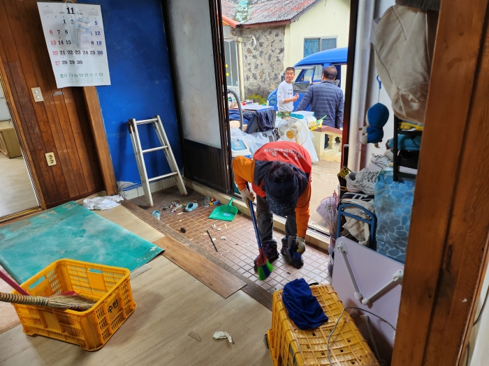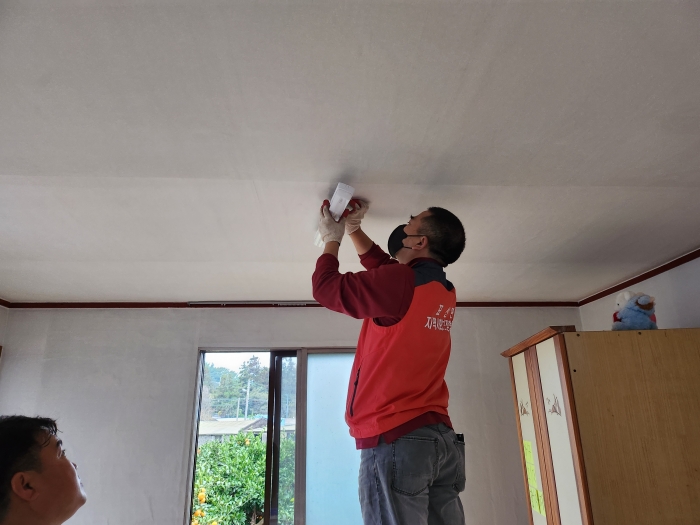 이날 표선면 지역사회보장협의체 회원들과 직원, 그리고 자원봉 사자들이 15명이 참여하여, 집 안 대청소에 이은 도배와 장판 교체는 물론 전열기를 모두 LED 등으로 교체하였으며, 욕실 창문이 부실하고 천정에서 빗물이 새고 있어, 지붕 방수공사와 창문을 하이샤시 이중창으로 교체하여 추운 겨울 욕실 사용에 불편이 없도록 배려하였다.