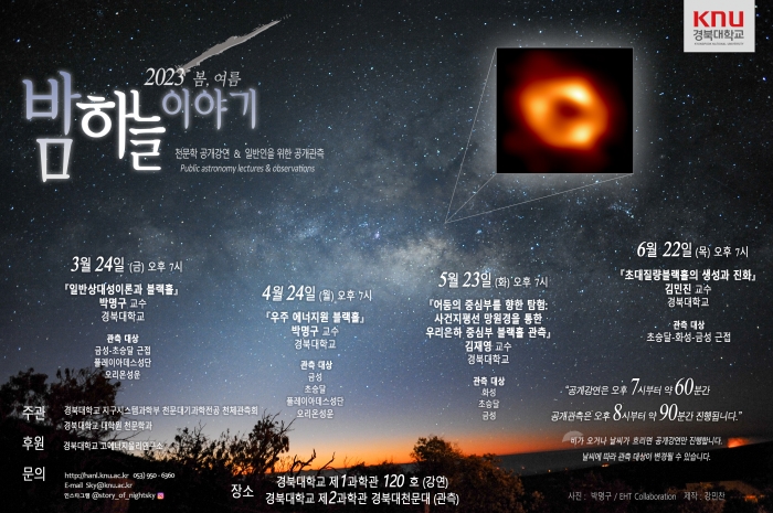 경북대 지구시스템과학부 천문대기과학전공은 ‘2023 봄, 여름 밤하늘 이야기’를 3월 24일과 4월 24일, 5월 23일, 그리고 6월 22일에 경북대 대구캠퍼스에서 개최한다.
