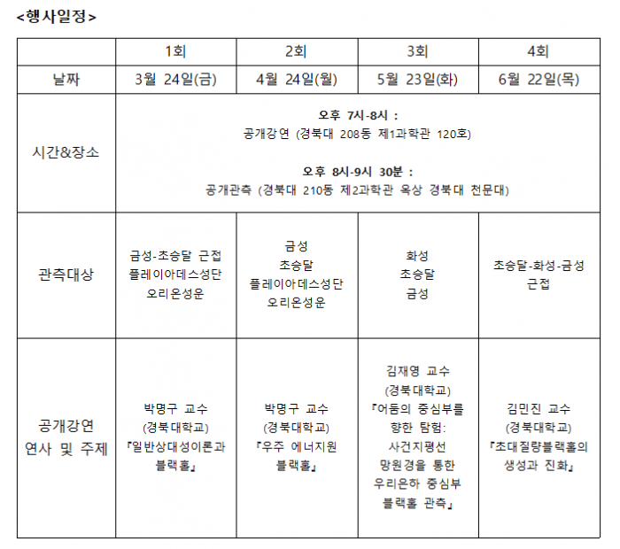 5월 강연은 사건지평선 망원경 관측에 직접 참여하고 있는 경북대 김재영 교수가 ‘어둠의 중심부를 향한 탐험: 사건지평선 망원경을 통한 우리은하 중심부 블랙홀 관측’을 주제로, 6월 강연은 경북대 김민진 교수가 ‘초대질량블랙홀의 생성과 진화’를 주제로 우주 블랙홀들을 실제로 어떻게 발견하고 질량을 재며 사진까지 찍을 수 있는지 살펴볼 예정이다.