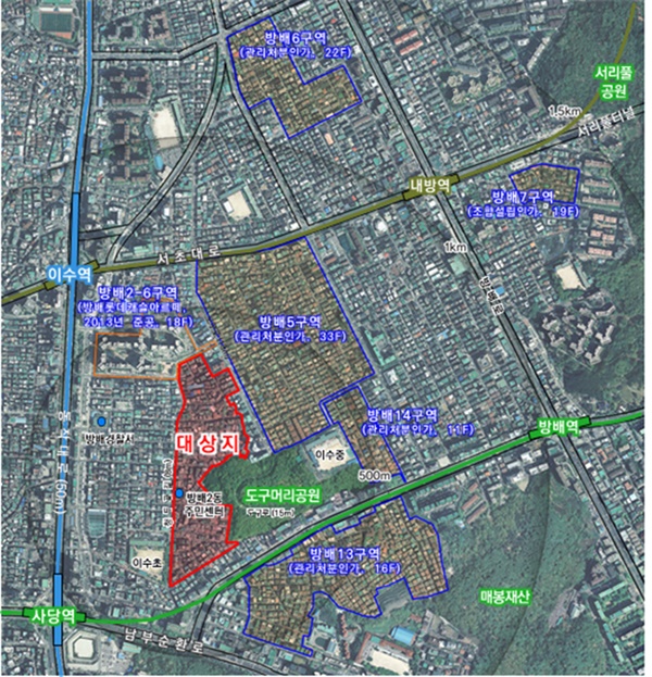 시는 구역 내 방배2동주민센터를 문화ㆍ사회복지시설을 포함해 남측 서초구 도구로1길(방배동) 일원에 새롭게 건립(2000㎡, 지하 2층~지상 3층)한다고 밝힌 바 있다.
