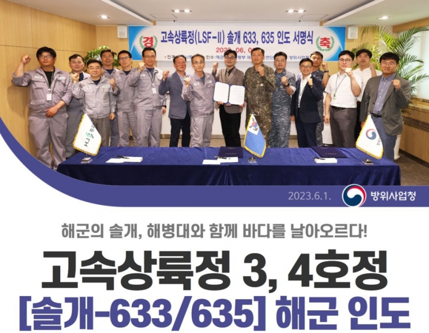 상륙작전의 핵심전력인 고속상륙정(LSF-II) 3, 4호정 "솔개-633/635호정"을 해군에 인도했다고 방위사업청이 1일 밝혔다. 2019년 6월 착공식 후 4년만이다.