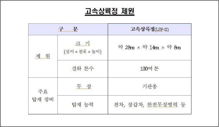 고속상륙정은 길이 약 28미터, 폭 약 14미터, 높이 약 8미터의 100톤급 함정으로, 해병대의 완전무장병력을 비롯해 전차, 장갑차 등을 탑재하고 고속으로 기동하면서 상륙작전을 수행할 수 있다.