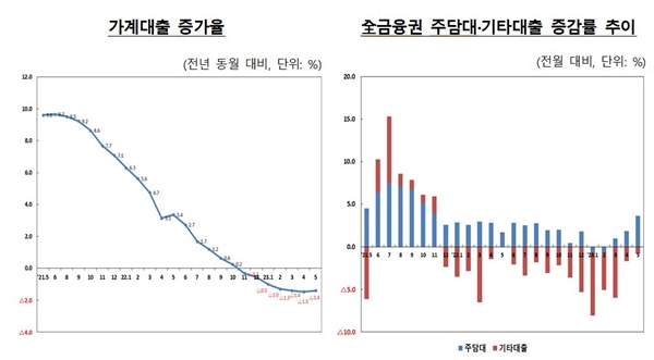 9일 금융위원회(이하 금융위)에 따르면, 올해 5월 전 금융권의 가계대출은 2조8000억 원이 증가했다. 가계대출은 지난해 11월부터 감소세를 이어오다 올해 4월 증가세로 전환한 뒤 2개월 연속 증가세를 유지하고 있다. 반면 대출잔액은 전년 동기 대비 증감률 –1.4%를 기록하며 감소세를 이어갔다.