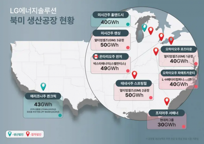 LG에너지솔루션은 현재 북미에서 2개의 단독 공장과 6개의 합작 공장을 운영 및 건설하며 고객 포트폴리오와 글로벌 생산능력을 지속적으로 확대해 나가고 있다.