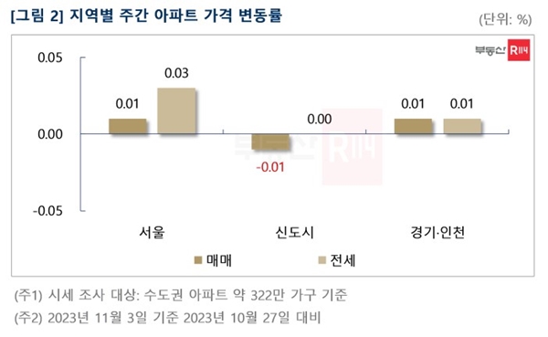 신도시는 ▲평촌(-0.03%) ▲분당(-0.01%)이 하락했으며 그 외 지역은 변동이 없었다.