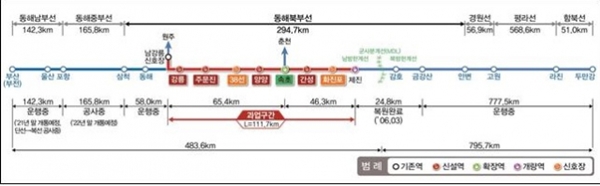 이 사업은 2027년 완공 목표 총사업비 2조7576억 원을 투입해 강원 강릉에서 양양, 속초를 거쳐 고성(제진역)까지 총 연장 111.7㎞를 신설할 계획이다.