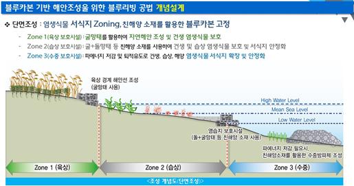 이번 숨쉬는 해안 시범 서식지 조성은 올해 5월 발표한 「블루카본 추진전략」의 일환으로 추진됐다. 숨쉬는 해안은 연안의 방파제ㆍ제방 등 인공구조물을 습지ㆍ산호초ㆍ인공사구 등 친해양 소재로 바꿔 자연해안선을 복원하는 것이다.