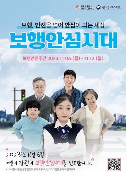 먼저, 행정안전부는 `보행, 안전을 넘어 안심이 되는 세상–우리가 함께 만들어가는 보행안심시대`를 보행안전주간 홍보 슬로건으로 정해서 보행안전수칙 등을 집중 홍보한다.