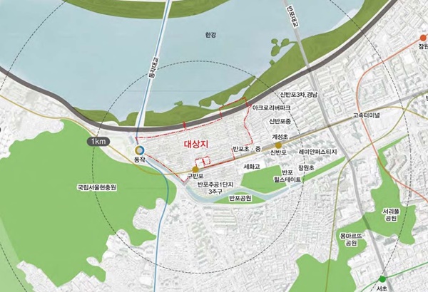 `강남 대표 단지`로 불리는 이곳은 지하철 9호선 구반포역이 도보 2분 거리, 동작역(4ㆍ9호선)과 신반포역(9호선)이 도보 15분 이내에 있고 동작대교, 올림픽대교 등과 인접해 도로교통이 탁월하다. 교육시설로 반포중, 세화여자중, 세화여자고, 세화고 등이 600m 부근, 서래초, 잠원초 등이 1km 부근에 있어 학세권의 조건을 두루 갖췄다. 더불어 한강, 반포종합운동장, 반포한강공원 등이 가까워 쾌적한 삶을 누릴 수 있다.