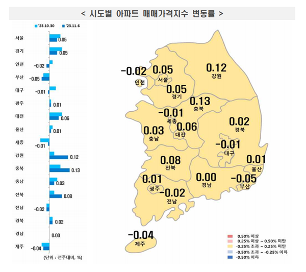 지방(0.02%)은 시ㆍ도별로 부산(-0.05%), 대전(0.06%), 대구(-0.01%), 충남(0.03%), 충북(0.13%), 강원(0.12%), 광주(0.01%), 울산(0.01%), 세종(-0.01%), 전남(-0.02%), 전북(0.08%), 경남(0%), 경북(0.02%), 제주(-0.04%) 등의 결과를 보였다.