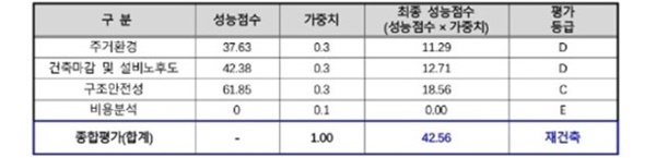 주민들은 올해 6월 서초구에 정밀안전진단을 요청한 결과 ▲주거환경 D등급(11.29점) ▲건축마감 및 설비노후도 D등급 (12.71점) ▲구조안전성 C등급(18.56점) ▲비용분석 E등급(0점) 등을 받은 것으로 나타났다. 단지는 앞으로 정비계획 마련과 정비구역 지정을 거쳐 사업 주체를 갖추게 된다. 이후 사업시행인가 및 관리처분인가 등의 절차를 밟는다.