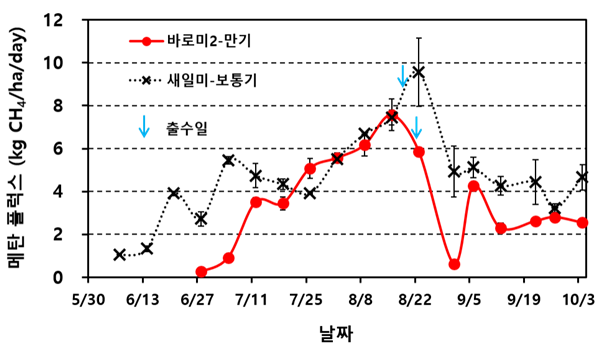 이는 ▲가루쌀 `바로미2`가 6월 하순 늦은 모내기를 하는 만기 재배에 적합하고, ▲중만생종 벼 대비 재배기간과 물을 가두는 기간이 짧기 때문으로 분석하고 있다. 논에서의 메탄 배출량은 기온과 같은 기상 환경, 물을 대는 기간, 벼의 생장량에 크게 영향을 받는다.