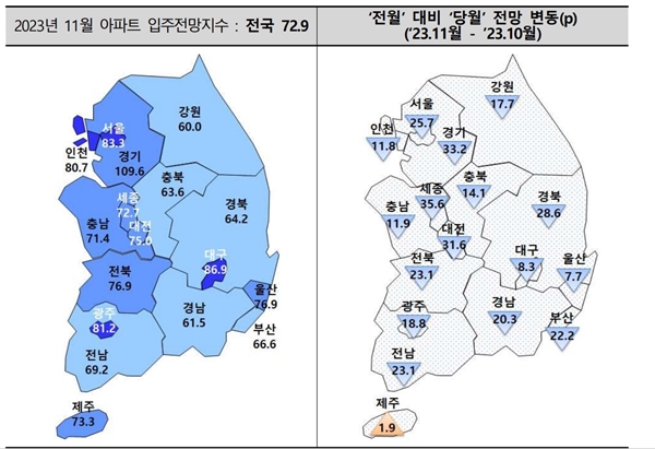 이달 아파트 입주전망지수는 지난 10월 92.4에서 19.5p 하락한 72.9로 조사됐다. 수도권은 23.6p(103.7→80.1), 광역시는 20.7p(97.2→76.5), 도 지역은 17.1p(84.6→67.5) 떨어지며 수도권ㆍ비수도권 모두 전망지수가 큰 폭의 하락세를 보였다. 특히 비수도권 중 대전(106.6→75)과 세종(108.3→72.7)의 입주전망지수가 큰 폭으로 하락했다.